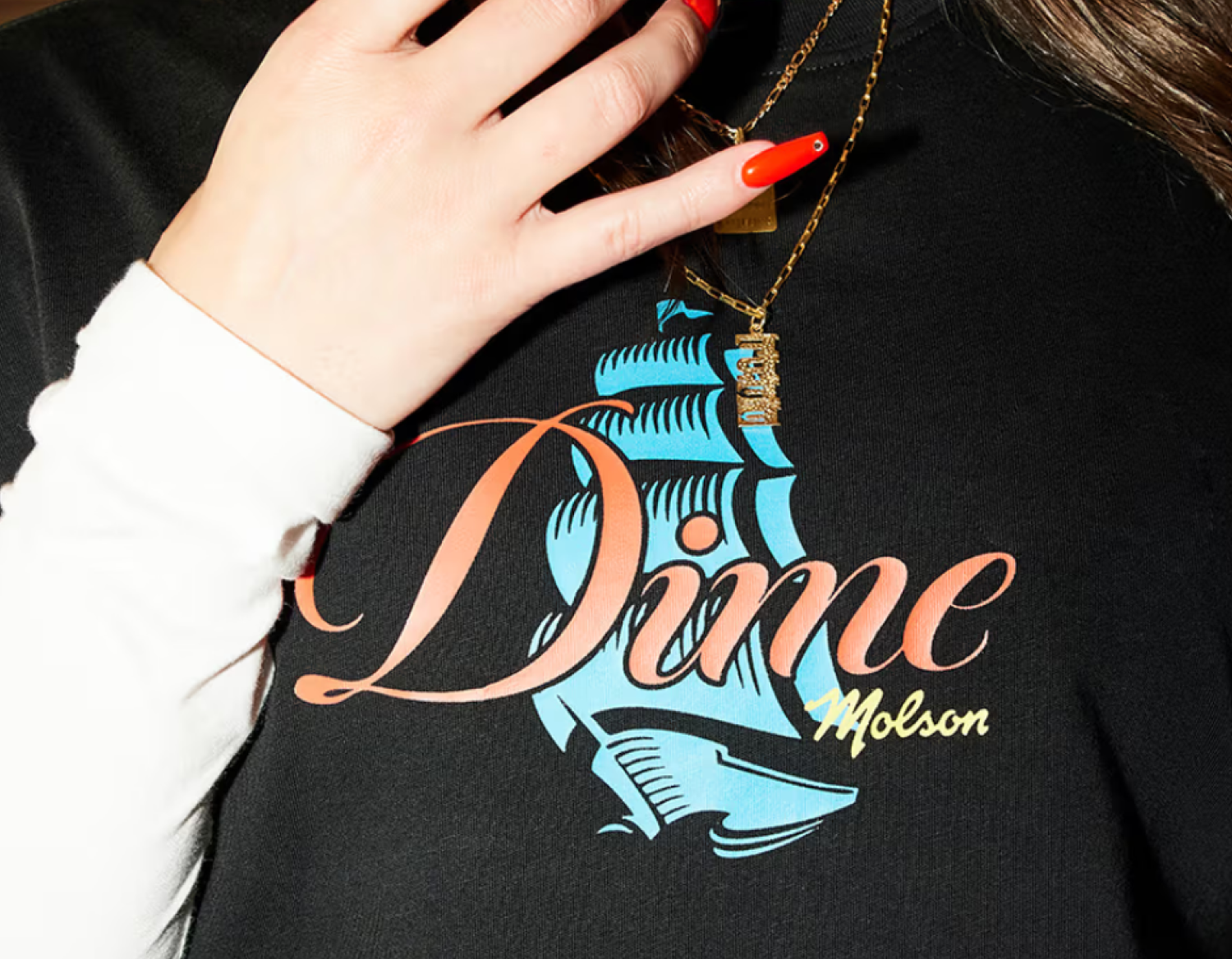 Featuring two co-branded t-shirts and a mug, the highlight of the capsule is a reimagined Dime logo rendered in Molson's iconic red, white, and blue palette. This distinctive fusion pays homage to both brands while offering a fresh, unified aesthetic.