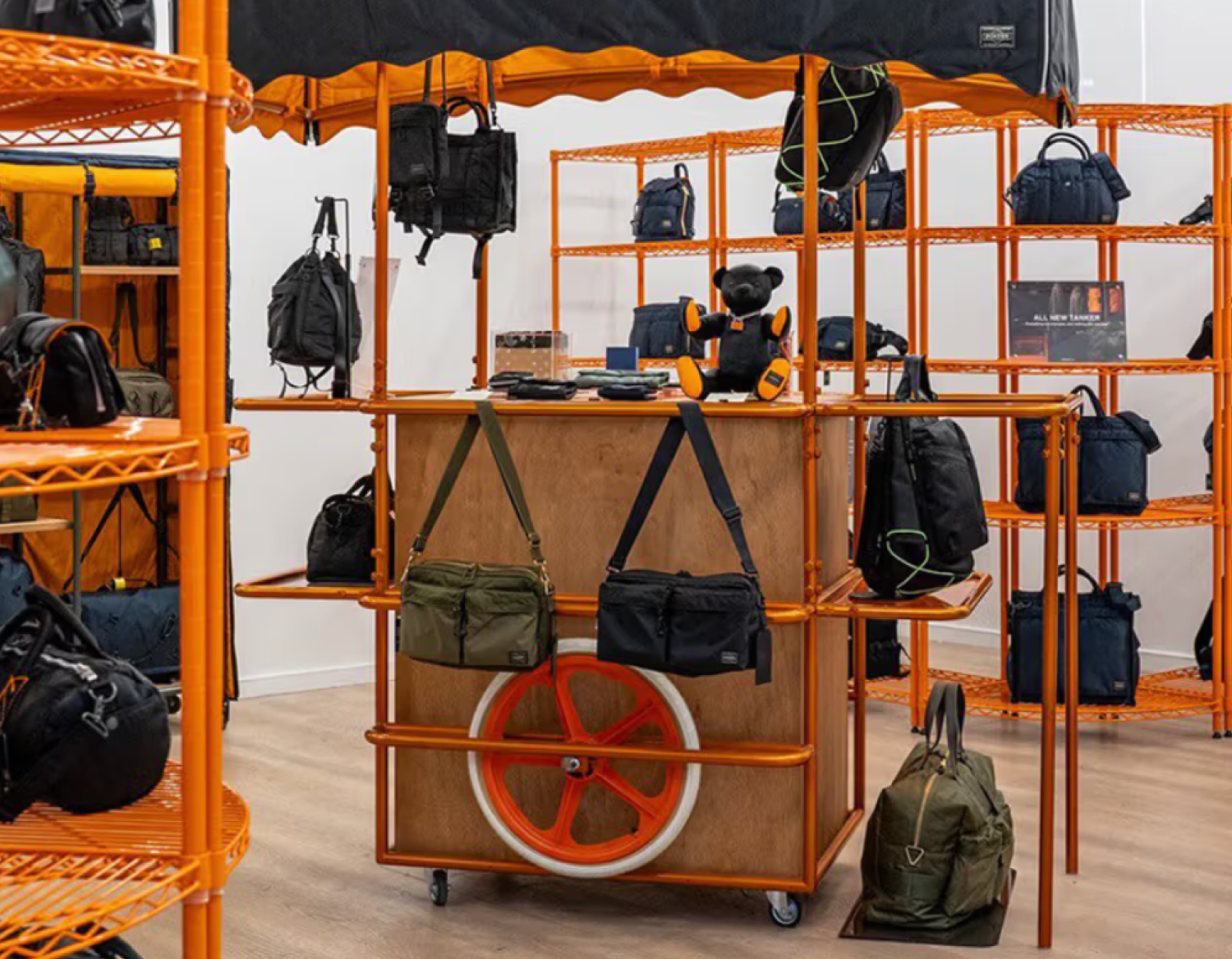 Though PORTER products have long been available in select U.S. retailers, this temporary space marks the company’s first standalone shop in the city. Visitors are welcomed by a life-size PORTER mascot and an interior designed with playful yet functional elements — from orange racks and nylon-paneled shelving to a vendor-style cart showcasing smaller items, including a teddy bear edition.